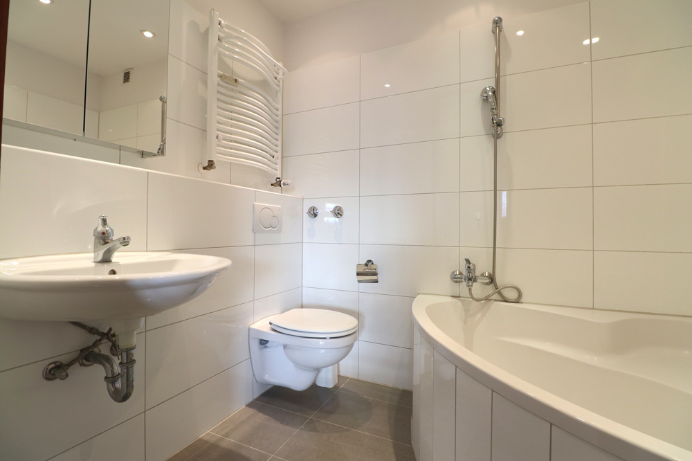 Die moderne 2-Zimmer-Wohnung mit ca. 66 m² Wfl. befindet sich im neunten Obergeschoss eines gepflegten Mehrfamilienhauses in Düsseldorf - Niederkassel. Zur Wohnung gehören neben einem innenliegenden Wannenbad mit WC und Waschbecken ein großzügiges und lichtduchflutetes Wohn-/ Esszimmer mit separater Wohnküche (inkl. Einbauküche mit Elektrogeräten) sowie ein Schlafzimmer und ein Abstellraum. Die Wände sind tapeziert und gestrichen, die Fußböden mit Laminat und Fliesen (Sanitärbereich) ausgestattet. Gemeinschaftlich genutzt werden der Wasch- sowie der Fahrradraum. Ein großzügiger West-Balkon mit Weitblick lädt zum Entspannen ein und rundet das attraktive Gesamtangebot ab. Der Energieverbrauchskennwert liegt bei günstigen 81 kWh/(m2a). Insgesamt