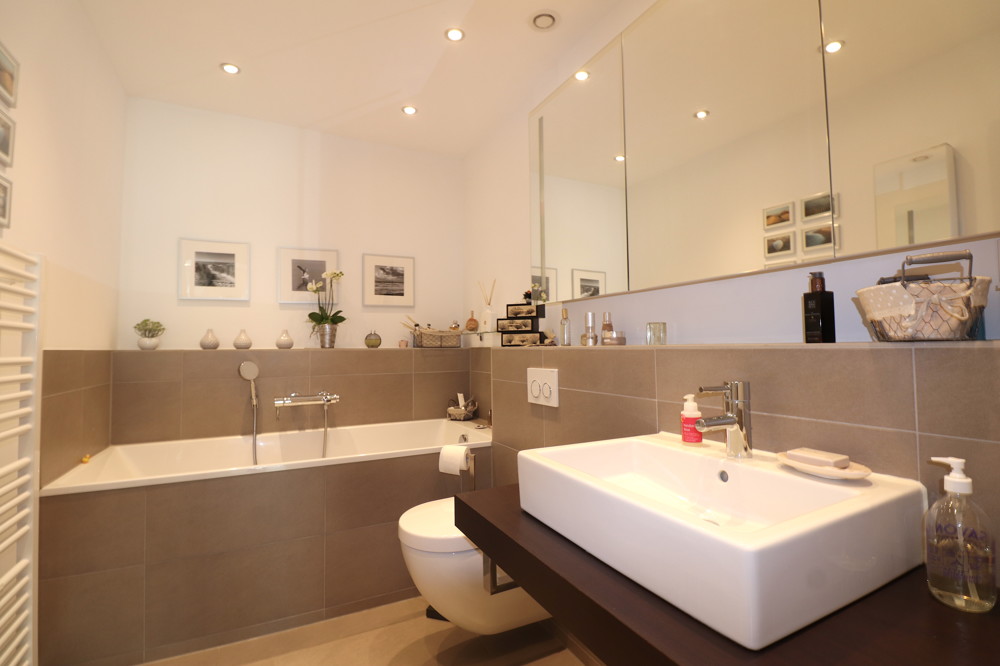 Ein weiteres Highlight dieser Immobilie sind zwei moderne Badezimmer mit ebenerdiger Dusche und Badewanne sowie hochwertigen Sanitärteilen. Diese Elemente kreieren separate Wohlfühlbereiche zum Entspannen.