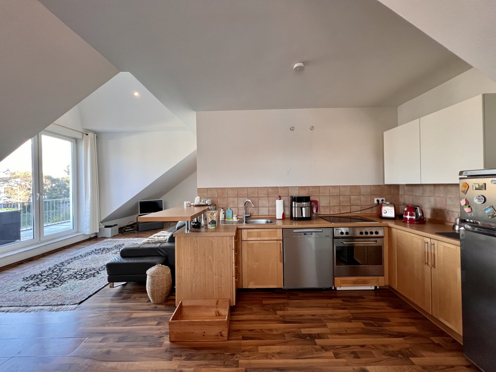 Des Weiteren verfügt die Wohnung über eine offene Küche und den daran anliegenden taghellen Essbereich.