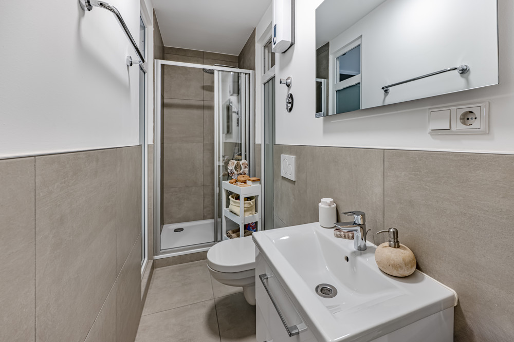 - Modern saniertes Badezimmer mit Dusche und praktischem Durchgangsfenster zur Belüftung