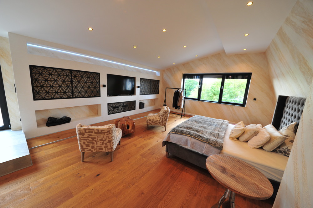 Der Eichendielenboden und die hochwertigen Eichentüren unterstreichen den exklusiven Charakter dieser Immobilie. Zahlreiche Einbauleuchten und Lichtsysteme sorgen für eine individuelle Beleuchtung und schaffen eine angenehme Atmosphäre. Eine Klima-Anlage und eine Luft-Wärme-Pumpe gewährleisten ein angenehmes Raumklima zu jeder Jahreszeit.