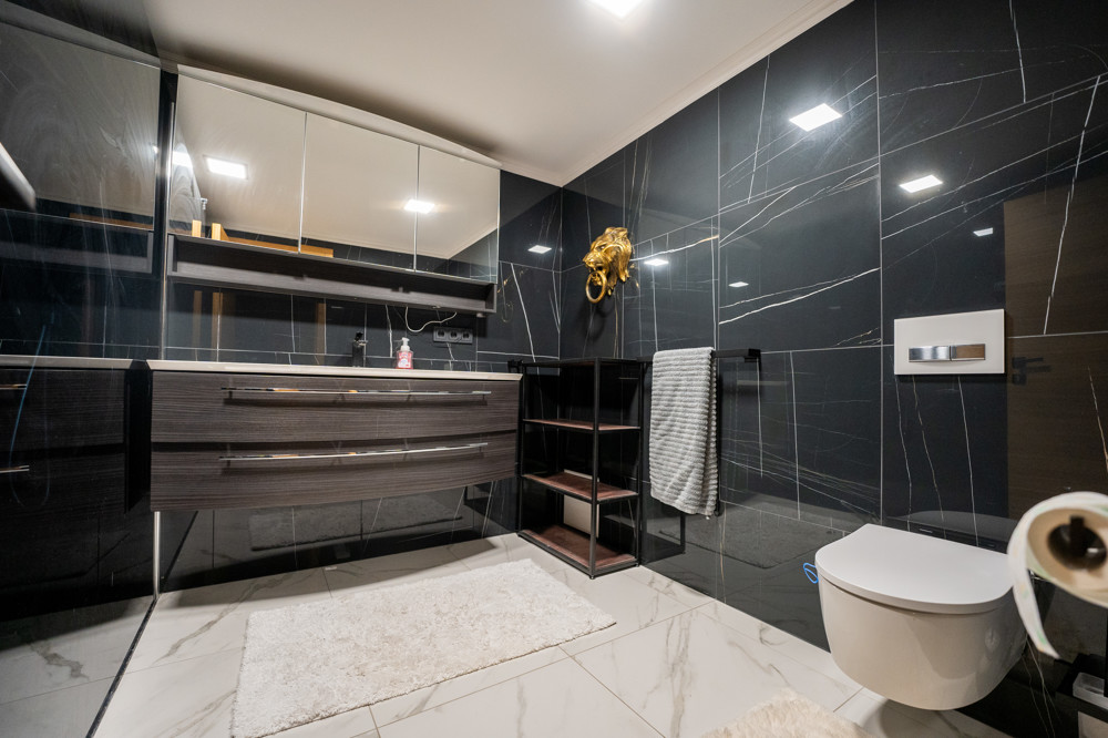 Das Badezimmer beeindruckt mit luxuriösen Elementen und einer erstklassigen Ausstattung. Dieses einladende Refugium bietet Ihnen einen wahren Ort der Entspannung und des Wohlbefindens.
