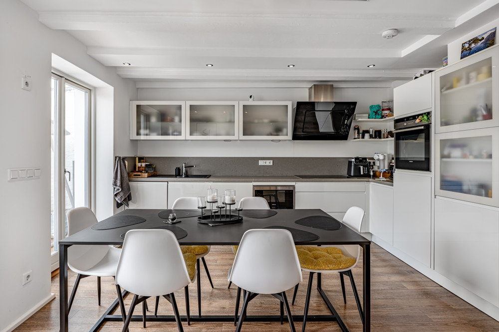 Bereits beim Betreten der Wohnung spürt man die besondere Atmosphäre, welche durch edle Materialien, harmonische Farbgebung und eine stilvolle Gestaltung unterstrichen wird. Die offene Küche ist mit einer hochwertigen Einbauküche samt modernster Elektrogeräte ausgestattet und fügt sich nahtlos in das elegante Wohnkonzept ein. Für entspannte Abende sorgt ein geschmackvoll integrierter Kamin, welcher Wärme und Behaglichkeit ausstrahlt. In den Decken verbaute Lautsprechersysteme bieten ein besonderes Klangerlebnis in allen Wohnbereichen. Maßgefertigte Einbauschränke schaffen zusätzlichen Stauraum und unterstreichen das durchdachte Design dieser Wohnung.