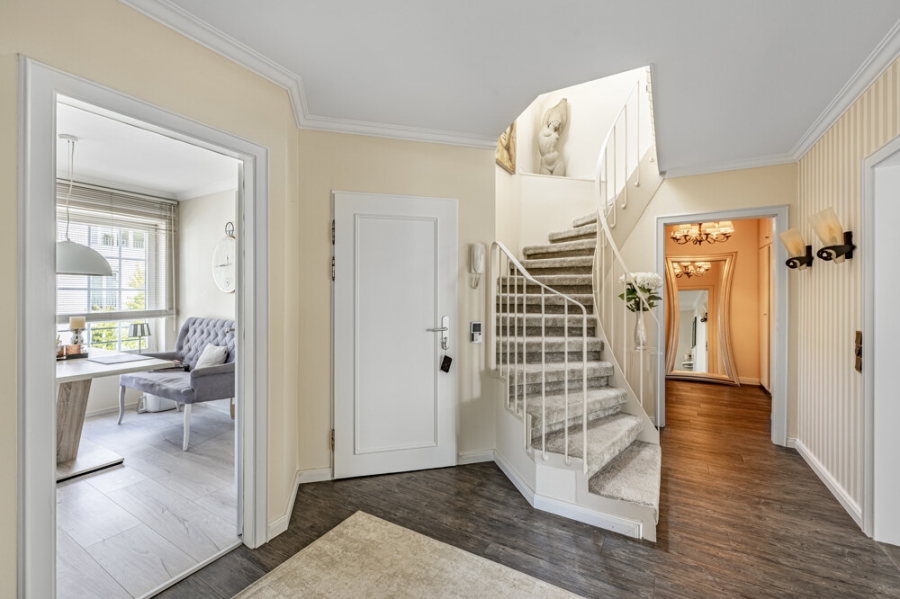 In einer der exklusivsten Wohnlagen Düsseldorfs, im angesehenen Stadtteil Golzheim, präsentiert sich diese besondere Penthouse-Maisonette-Wohnung mit circa 201 m² Wohnfläche . Nur wenige Schritte vom Rhein entfernt, in zweiter Reihe gelegen, verbindet sie großzügige Architektur mit einem Wohngefühl, welches Eleganz und Komfort auf eindrucksvolle Weise vereint.