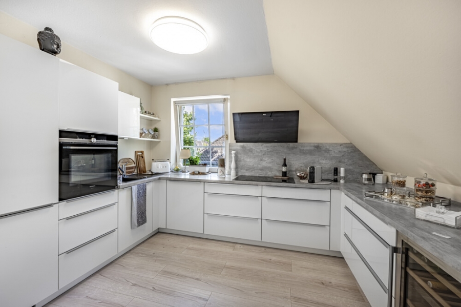 Die erste Ebene empfängt mit einem hellen und weitläufigen Raumkonzept. Die hochwertige Wohnküche mit modernsten Geräten und integriertem Weinkühlschrank bildet das Herzstück und lädt zum geselligen Kochen und Genießen ein. Angrenzend öffnet sich das großzügige Wohnzimmer mit seinen charakteristischen Sprossenfenstern und dem direkten Zugang zur Dachterrasse in Westausrichtung – ein Ort, an dem sich die Abendsonne und die noble Umgebung in besonderer Atmosphäre erleben lassen. Ein weiteres Schlafzimmer sowie ein stilvolles Badezimmer runden diese Ebene ab.