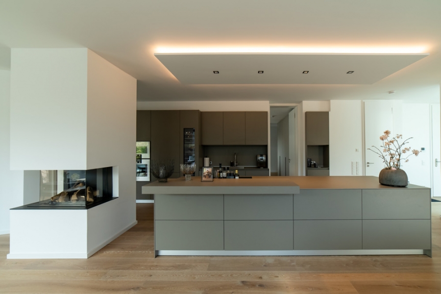 Im Mittelpunkt des offen gestalteten Wohnbereichs befindet sich die hochwertig ausgestattete Bulthaup-Wohnküche mit Gaggenau-Geräten – stilvoll eingebettet in eine Umgebung aus edlen Materialien, warmem Parkett und durchdachter Lichtgestaltung.