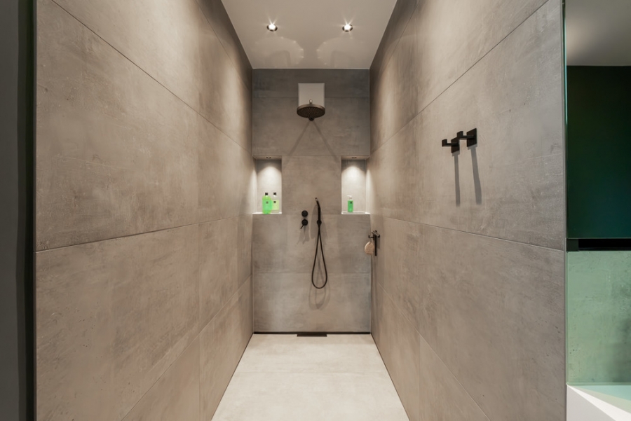 Zwei exklusive Bäder, welche höchsten Ansprüchen gerecht werden, überzeugen mit großzügigen, barrierefreien Duschen, eleganten Wandnischen und einer freistehenden Designer-Badewanne. Die mattschwarzen Armaturen und die edlen Feinsteinzeug-Fliesen, welche in hochwertiger Verarbeitung und zeitloser Ästhetik erstrahlen, fügen sich harmonisch in das elegante Gesamtbild der Wohnung ein und schaffen eine luxuriöse Wohlfühloase.