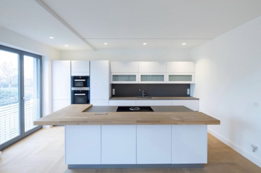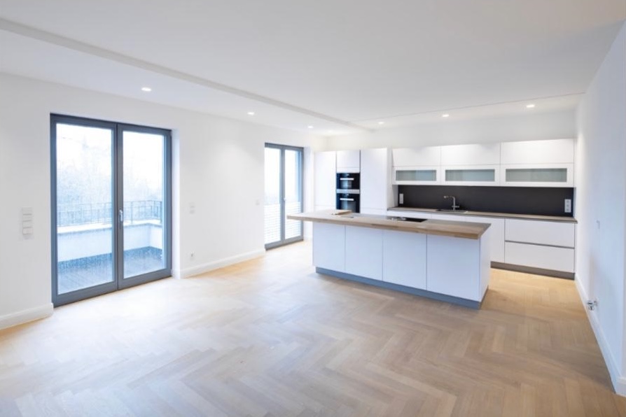 Der großzügige Wohn-, Ess- und Küchenbereich bildet das Herzstück der Wohnung. Die offene Küche ist mit modernsten Geräten ausgestattet – darunter ein BORA-Kochfeld mit integriertem Abzug – und fügt sich harmonisch in den Wohnraum ein. Hier verbinden sich Funktionalität und Design zu einem Ort des Zusammenkommens und Genießens.
