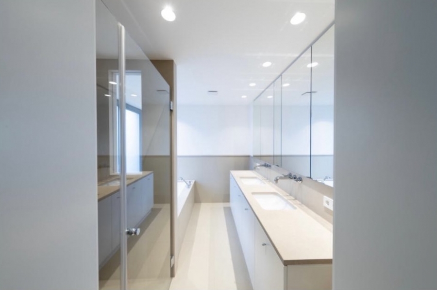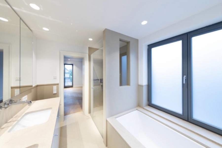 Das exklusive Badezimmer überzeugt mit edlen Materialien und klarer Linienführung: Ein Doppelwaschtisch, hochwertige Armaturen, eine bodentiefe Dusche und edler Naturstein schaffen eine luxuriöse Wellnessatmosphäre.