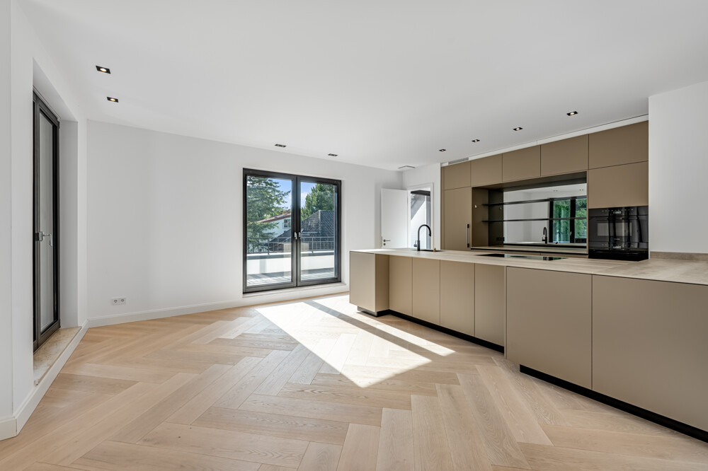Offene Wohnküchen mit maßgefertigten Einbauten von Molteni und modernster Miele-Gerätetechnik verbinden Ästhetik mit Funktionalität auf höchstem Niveau. Die Bäder überzeugen mit Armaturen von Dornbracht, freistehenden Designerwannen, bodengleichen Duschen und hochwertigen Doppelwaschtischen. Ergänzt wird das Interior durch maßgefertigte Einbauschränke, fein abgestimmte Schalterprogramme und zahlreiche exklusive Details.